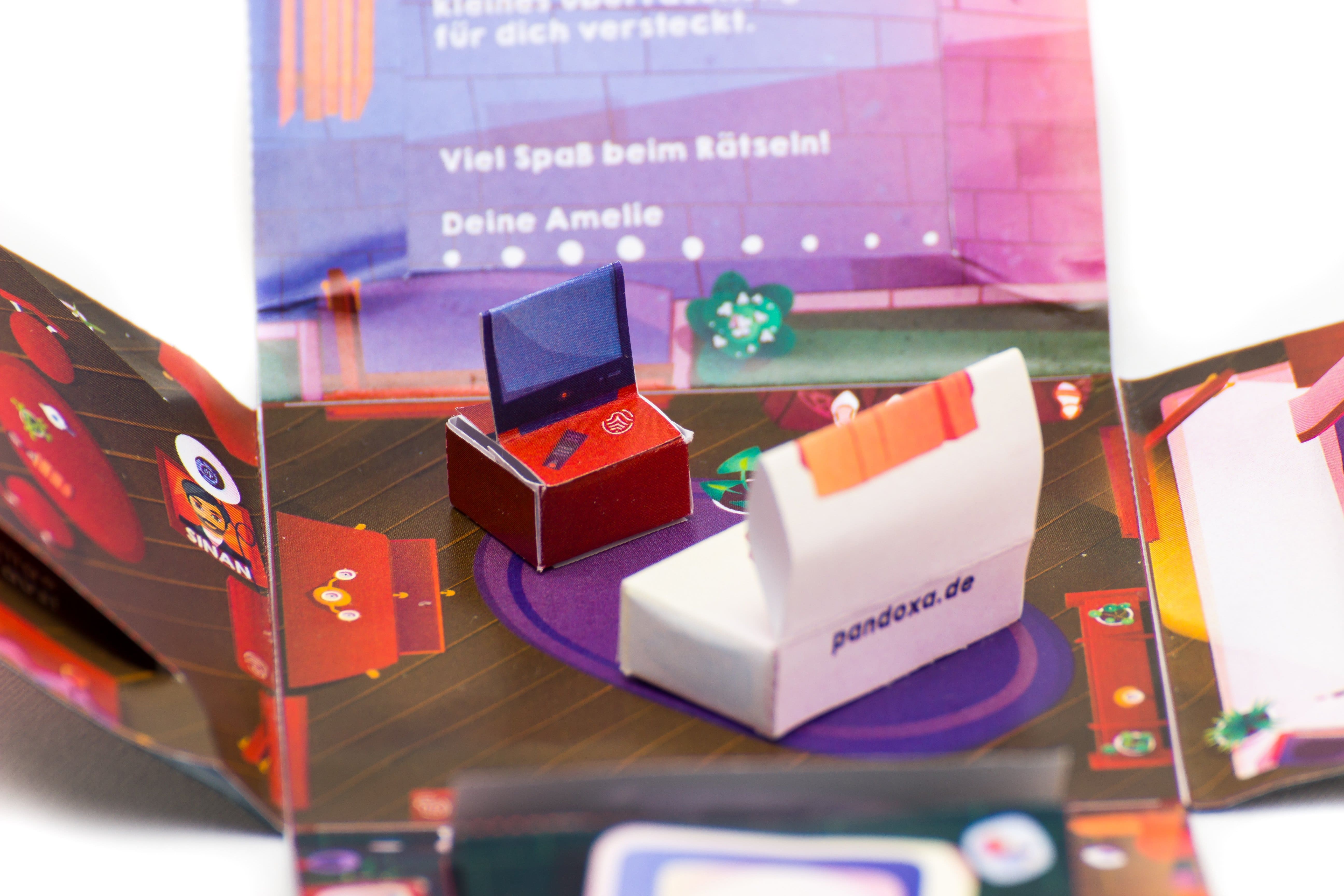 | 2. Abgedruckte Rätsel | Als nächstes muss der Empfänger die kleinen abgedruckten Rätsel lösen. Es handelt sich um witzige Rätsel im Exitgame-Stil. Hier muss auch mal um die Ecke gedacht werden. |