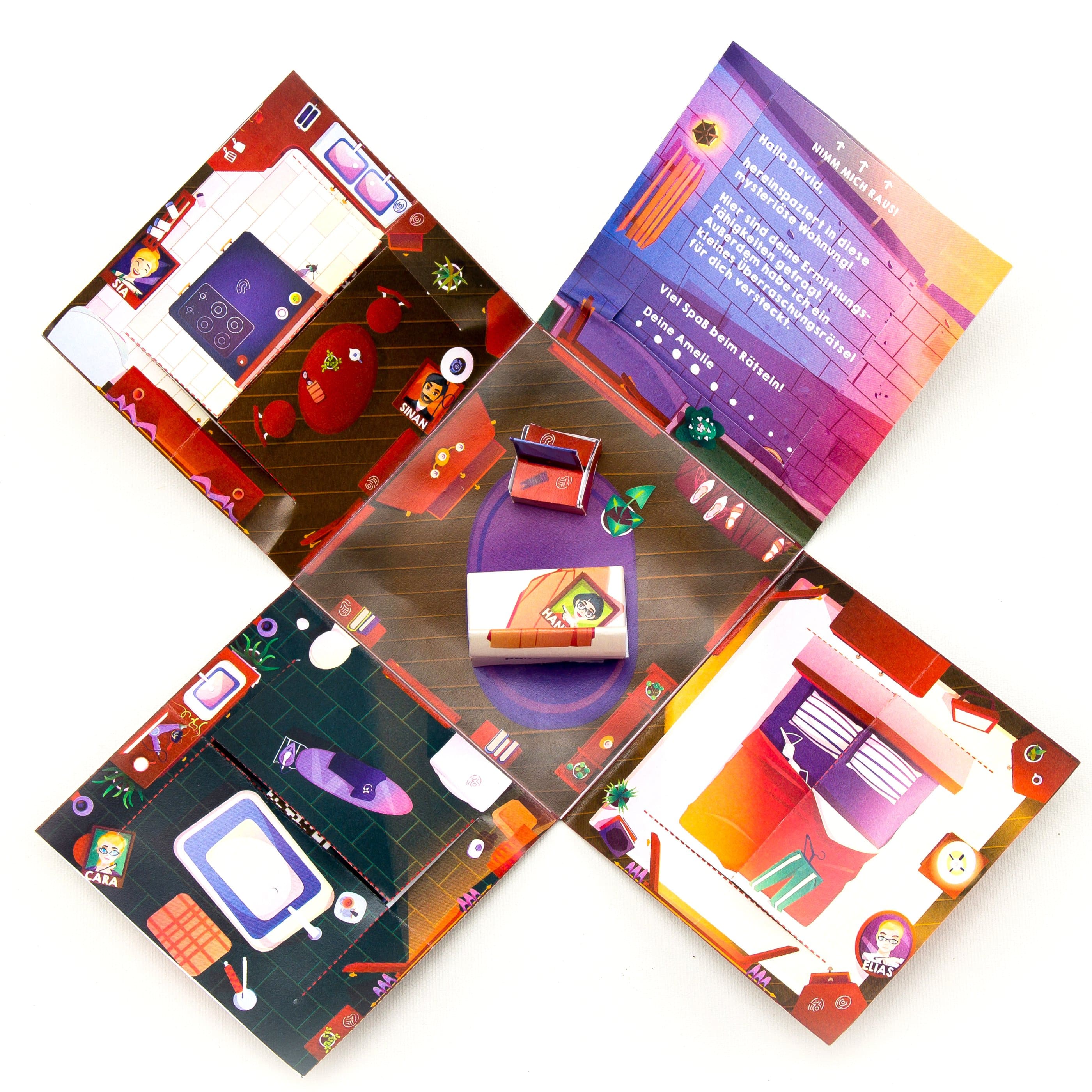 Fordere das beschenkte Kind mit dieser mysteriösen Tatwohnung heraus. Neben deinen persönlichen Fragen muss es auch spannende Rätseln lösen, um an deinen vorbereiteten Gutschein zu gelangen.