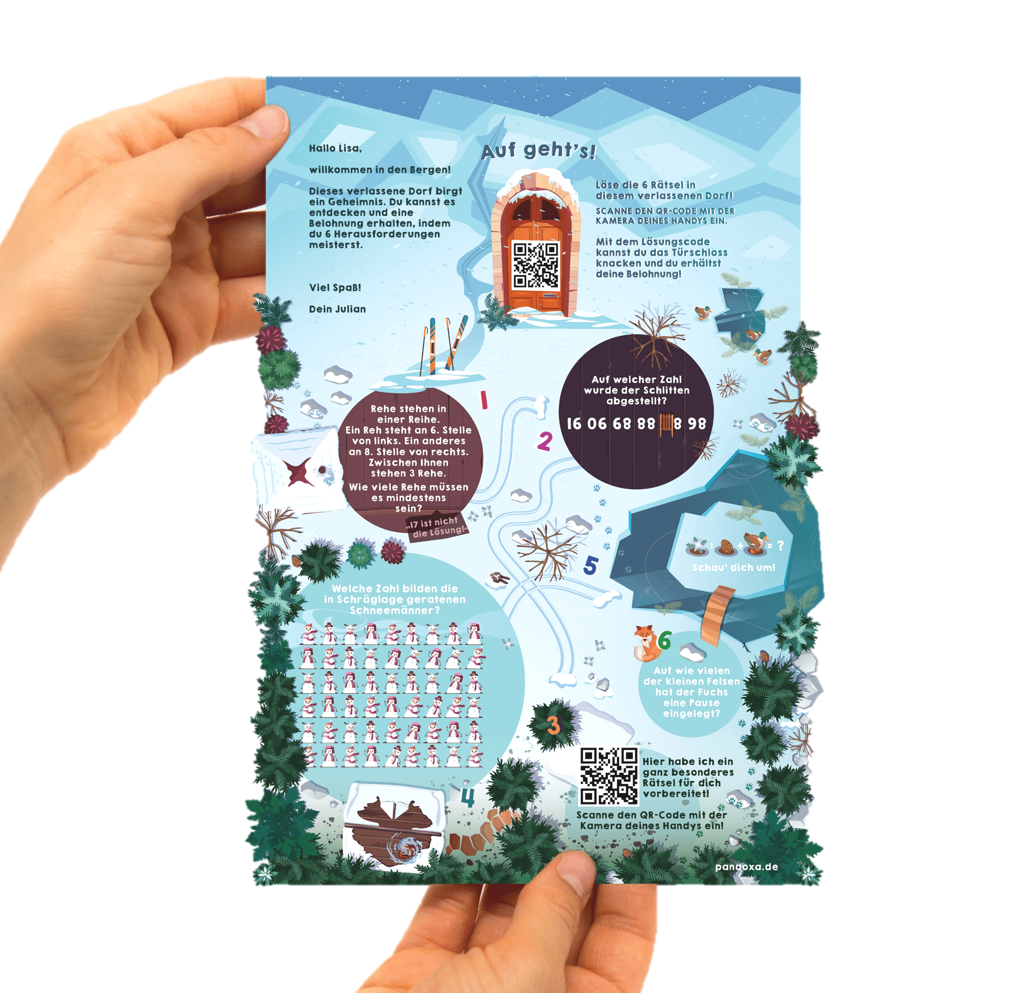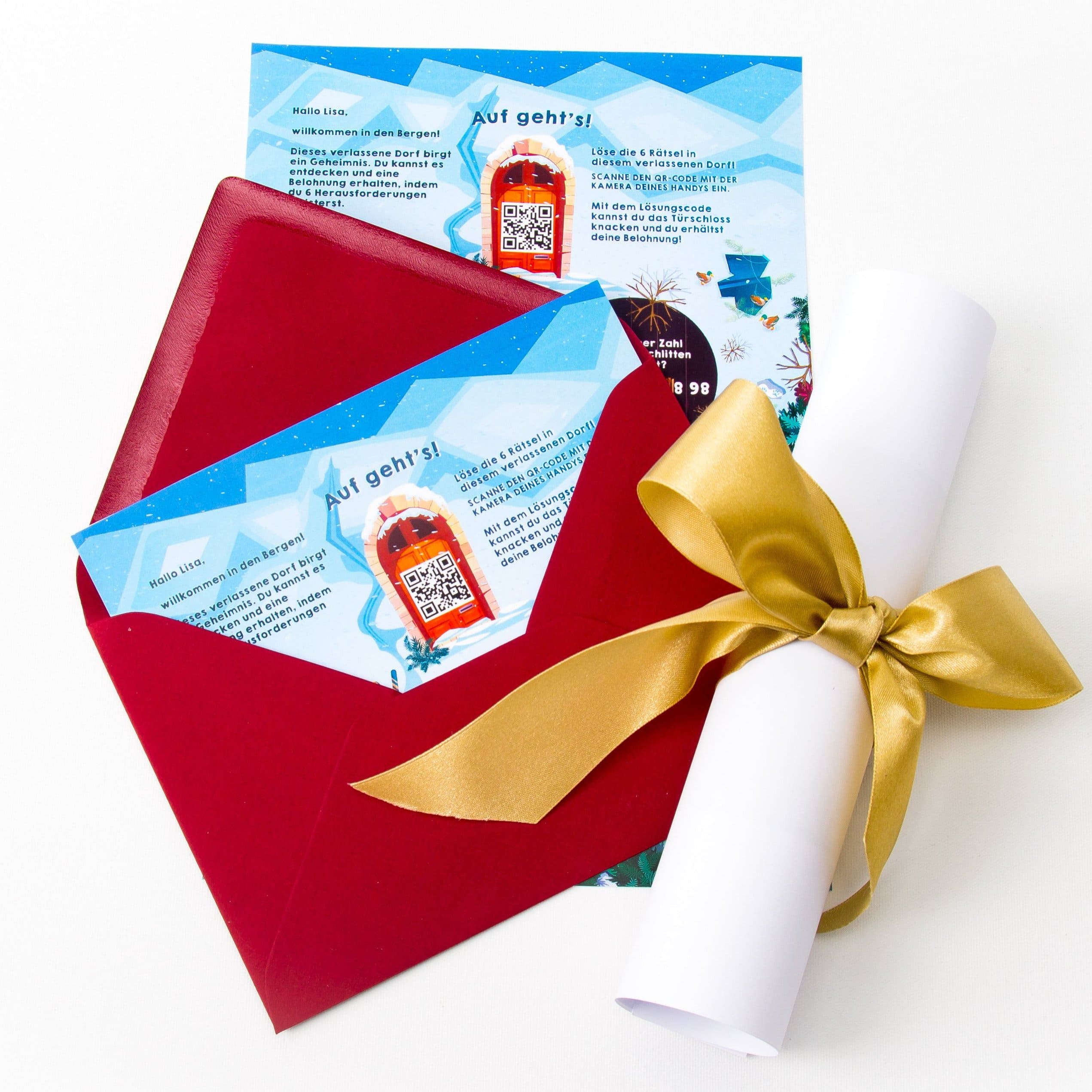 Entführe die beschenkte Person in eine romantische Winterlandschaft. Neben deinen persönlichen Fragen muss sie auch spannende Herausforderungen lösen, um an deinen vorbereiteten Gutschein zu gelangen.